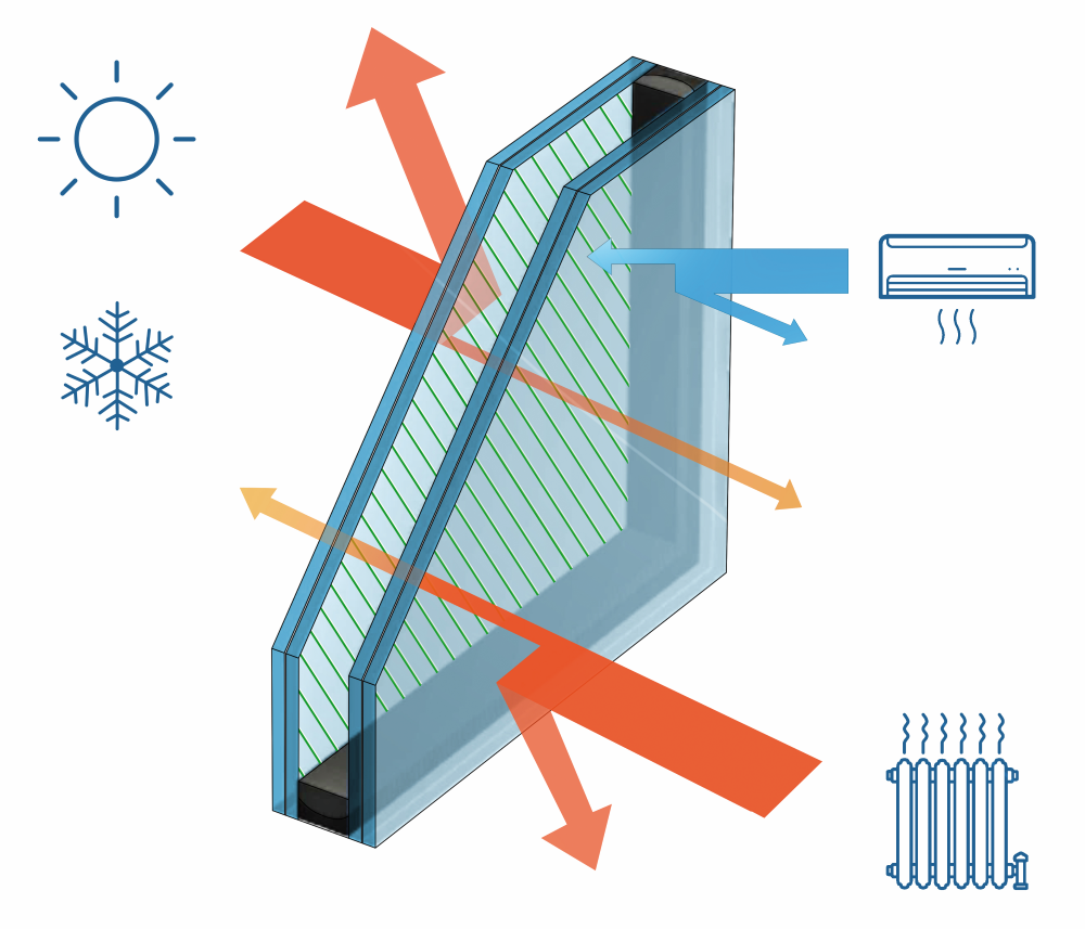 I vetri basso emissivi e selettivi permettono il transito della radiazione luminosa, evitando invece il passaggio della radiazione infrarossa impedendo la dispersione del calore verso l’esterno (basso emissivo) e il passaggio di calore verso l’interno (selettivi)