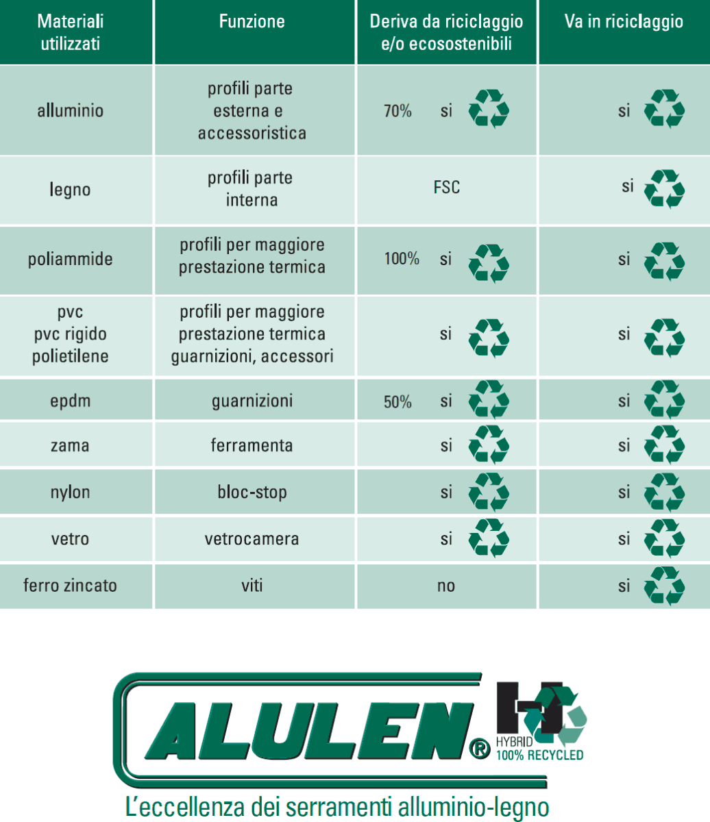 Il sistema ALULEN è ideato e realizzato per rispettare l’ambiente, nella convinzione che la tutela delle risorse naturali sia un obiettivo primario. ALULEN pertanto privilegia i materiali riciclabili e separabili tra di loro.
